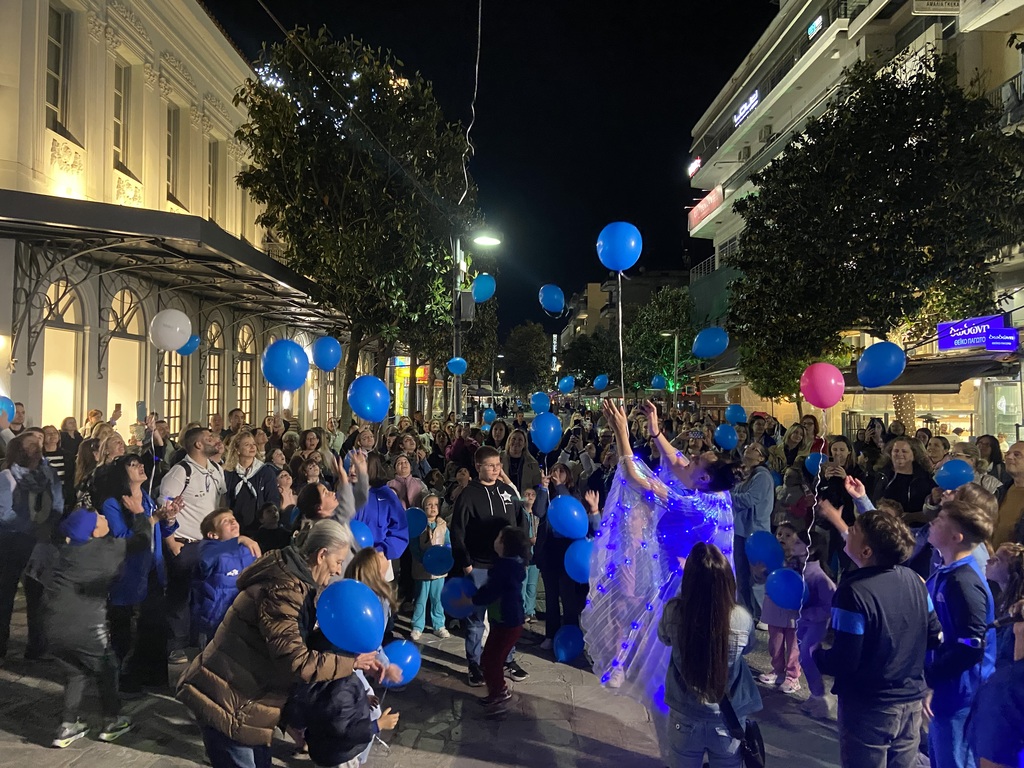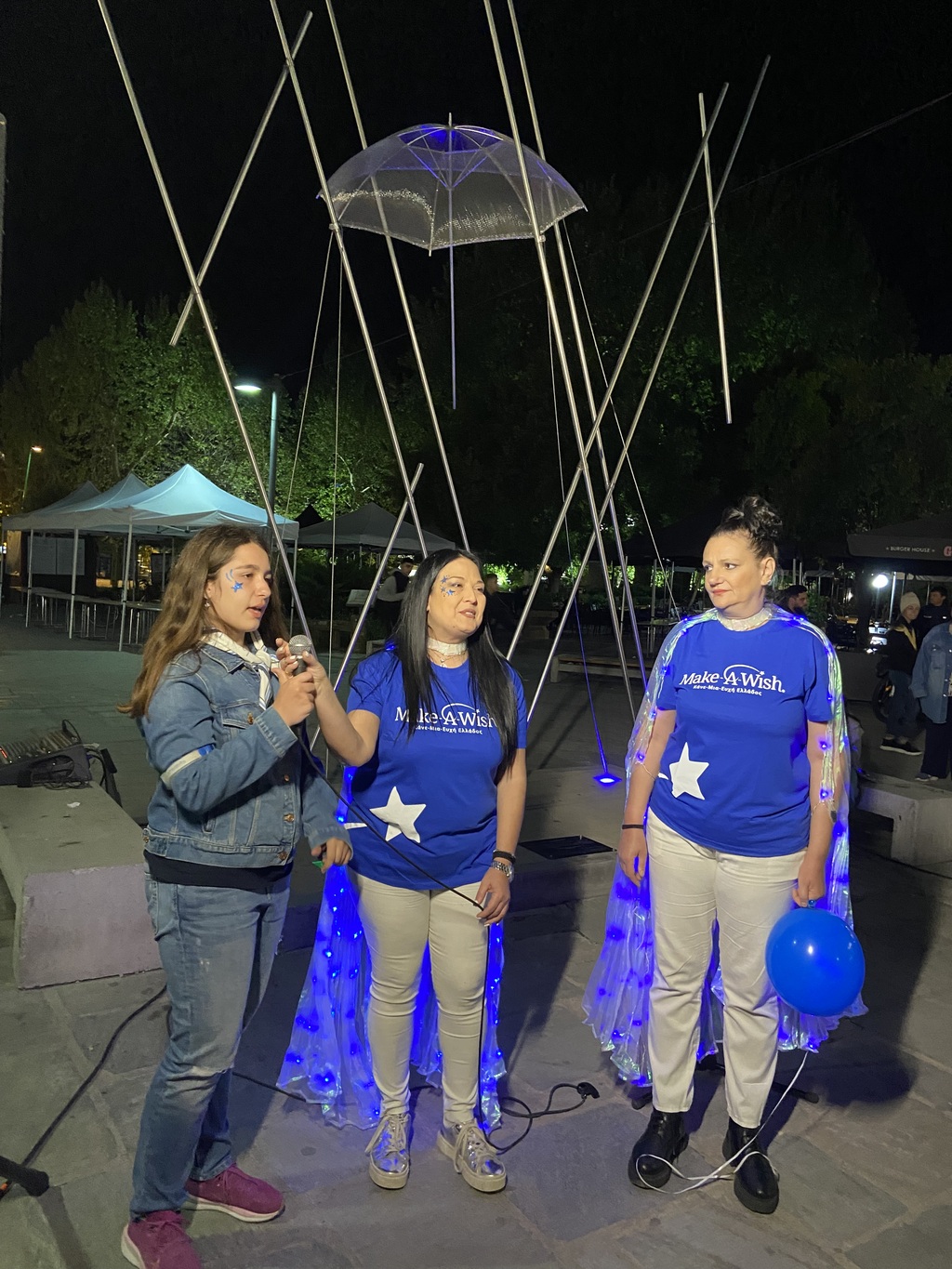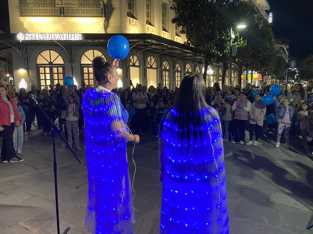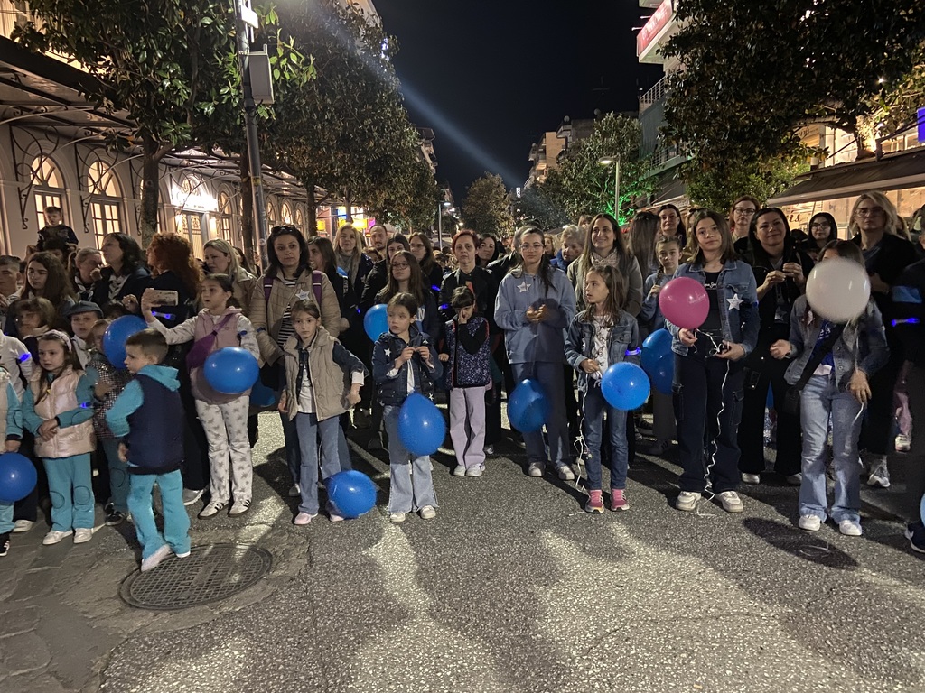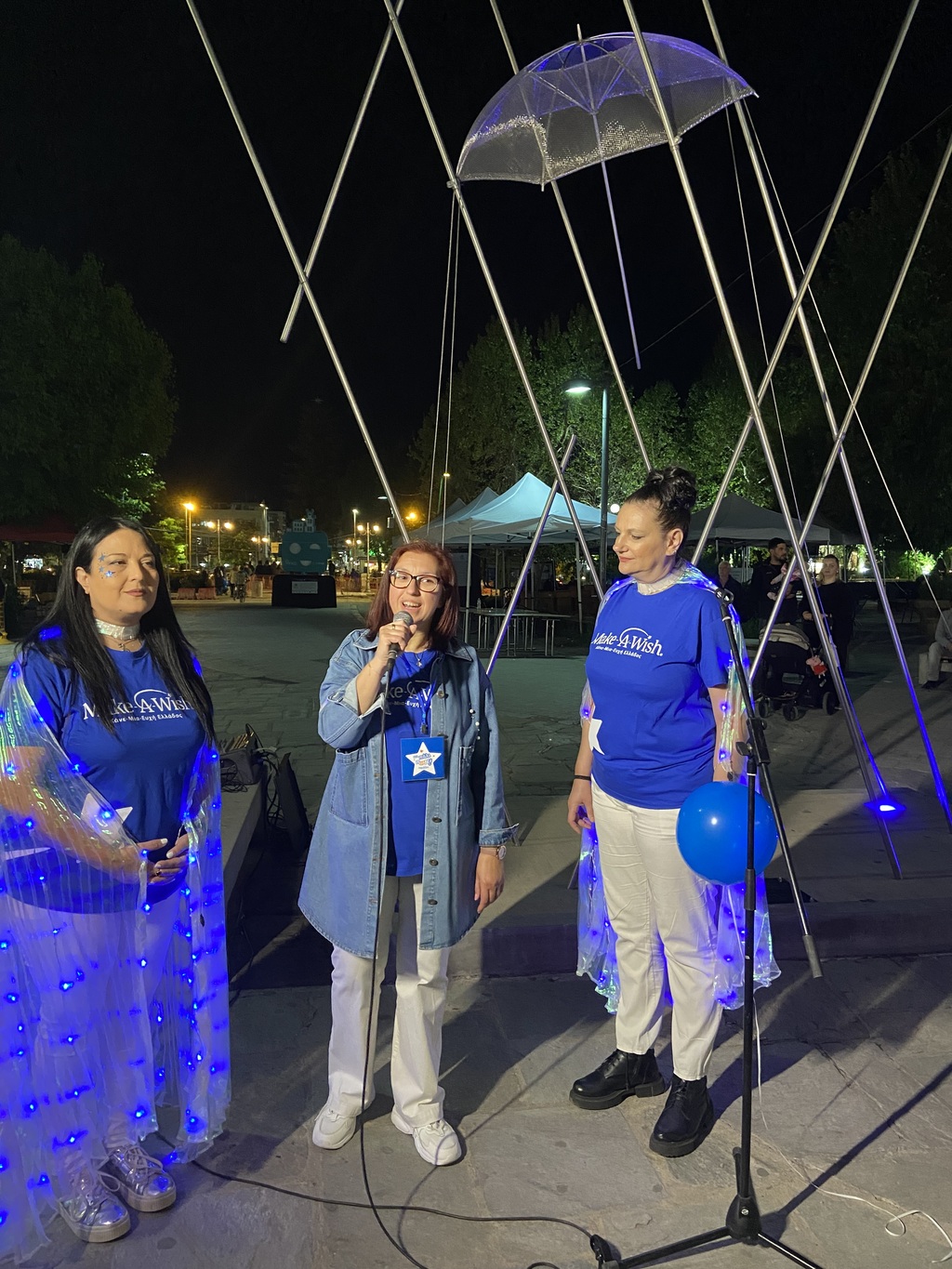 Στη συνέχεια πραγματοποιήθηκεπορεία με φωτισμένα φαναράκια στους κεντρικούς δρόμους της πόλης, με κατάληξη την Ομπρέλα Ζογγολόπουλου, λίγα μέτρα πιο μακριά από τη φωταγωγημένη με το μπλε χρώμα για την εκδήλωση, κεντρική πεζογέφυρα των Τρικάλων. Εκεί, μίλησαν παιδιά που ικανοποίησαν ευχές τους, συγκινώντας κάθε παριστάμενο/η. Στη συνέχεια, η υπεύθυνη δράσης του Make A Wish Ελλάδας για τα Τρίκαλα – μητέρα παιδιού ευχής κ. Μαρίνα Παλλαντζά, αναφέρθηκε στους σκοπούς της οργάνωσης και στο χαμόγελο που προσφέρει σε παιδιά. Ευχαρίστησε τον Δήμο Τρικκαίων για την ενεργή στήριξη και συνδιοργάνωση, ενώ αναφέρθηκε ευχαριστώντας και «τους Συλλόγους Γονέων και Κηδεμόνων σχολείων Πρωτοβάθμιας και Δευτεροβάθμιας Εκδήλωσης, που παρέστησαν στην εκδήλωση, στα ΚΔΑΠ ΑΓΙΑ ΑΝΝΑ και ΑΠΙΘΑΝΟΙ, στην ACT4V, στο Σώμα Ελληνικού Οδηγισμού, που συμμετείχαν στις δραστηριότητες, στη χορηγό εταιρεία ΒΙΟΣΑΛ, στις εμψυχώτριες Βίκυ Φαγκρίδα και Βάγια Γουλοπούλου, στο Βιβλιοπωλείο Παπαγιάννη, στον Φώτη Πάσσο για τις βιντεολήψεις, στον Ηλία Ζαχαράκη Foto Center για τις φωτογραφίες, στη Rock School of Music και τον Κώστα Μυλωνά, στη Χρύσα Παπαγεωργίου για το face painting, τις εκτυπώσεις αδελφών Μπέκου, την επιχείρηση «Σαν παραμύθι» – Χριστίνα Αλιπράντη».