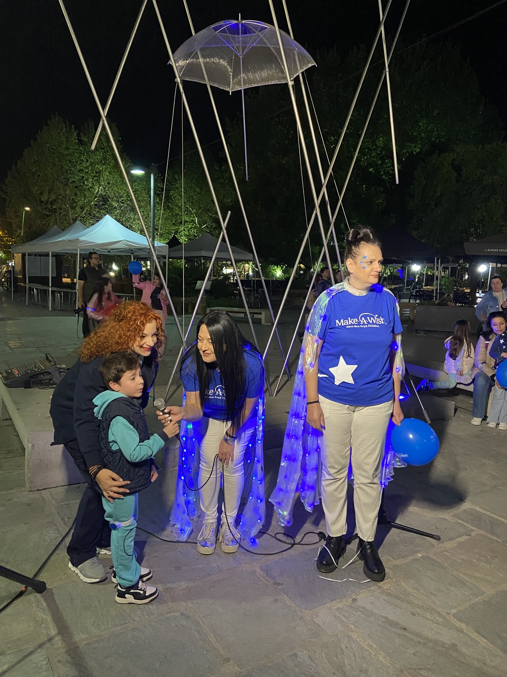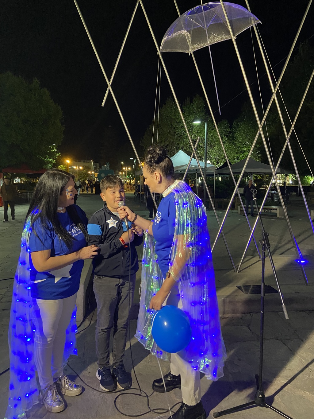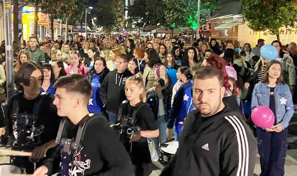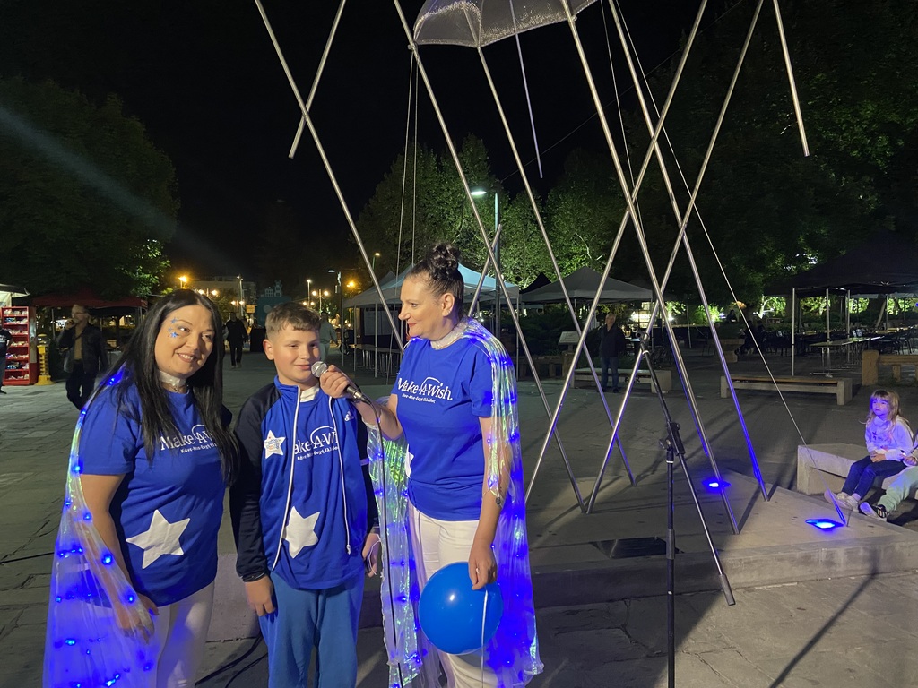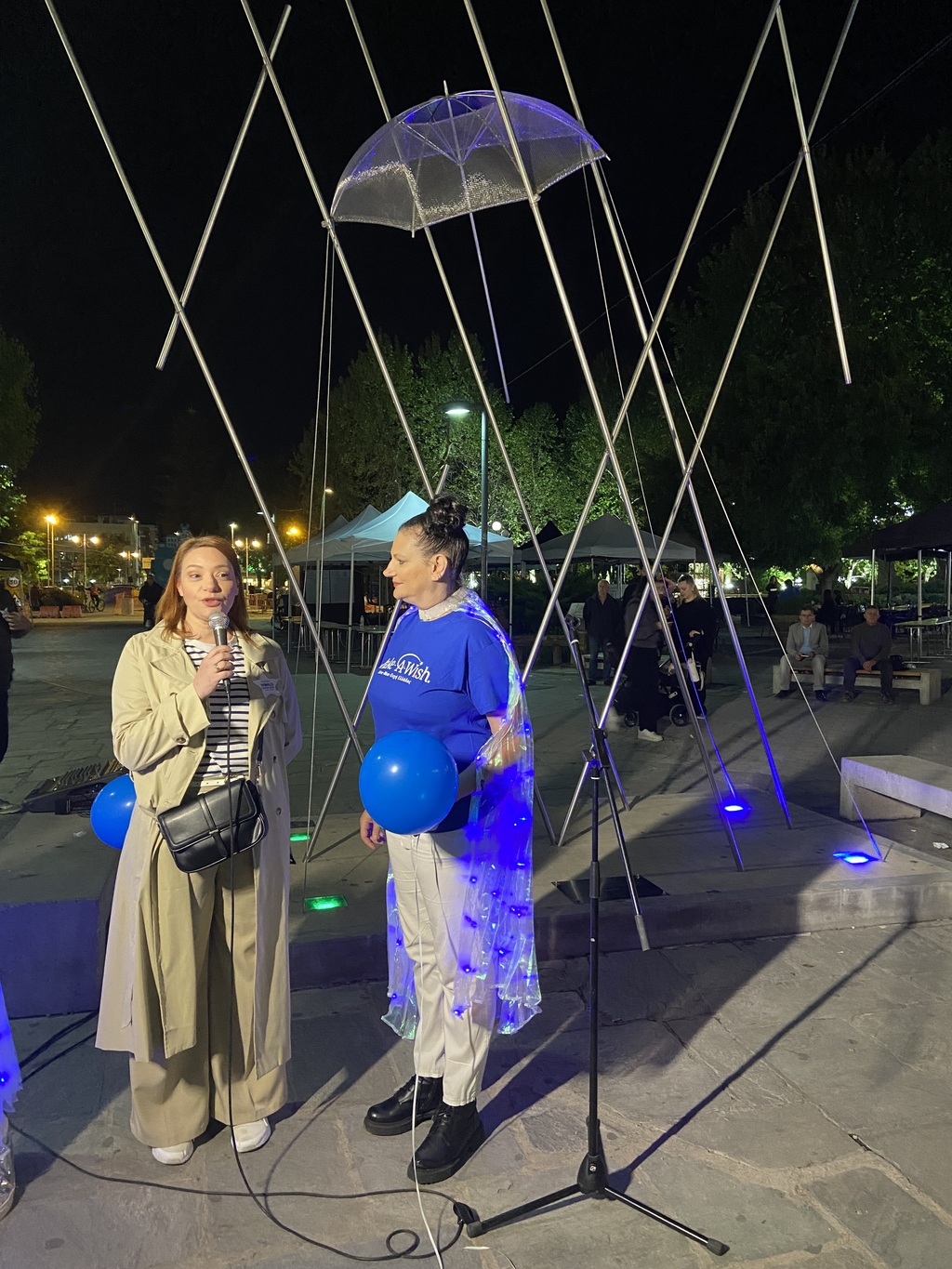 Στη συνέχεια πραγματοποιήθηκεπορεία με φωτισμένα φαναράκια στους κεντρικούς δρόμους της πόλης, με κατάληξη την Ομπρέλα Ζογγολόπουλου, λίγα μέτρα πιο μακριά από τη φωταγωγημένη με το μπλε χρώμα για την εκδήλωση, κεντρική πεζογέφυρα των Τρικάλων. Εκεί, μίλησαν παιδιά που ικανοποίησαν ευχές τους, συγκινώντας κάθε παριστάμενο/η. Στη συνέχεια, η υπεύθυνη δράσης του Make A Wish Ελλάδας για τα Τρίκαλα – μητέρα παιδιού ευχής κ. Μαρίνα Παλλαντζά, αναφέρθηκε στους σκοπούς της οργάνωσης και στο χαμόγελο που προσφέρει σε παιδιά. Ευχαρίστησε τον Δήμο Τρικκαίων για την ενεργή στήριξη και συνδιοργάνωση, ενώ αναφέρθηκε ευχαριστώντας και «τους Συλλόγους Γονέων και Κηδεμόνων σχολείων Πρωτοβάθμιας και Δευτεροβάθμιας Εκδήλωσης, που παρέστησαν στην εκδήλωση, στα ΚΔΑΠ ΑΓΙΑ ΑΝΝΑ και ΑΠΙΘΑΝΟΙ, στην ACT4V, στο Σώμα Ελληνικού Οδηγισμού, που συμμετείχαν στις δραστηριότητες, στη χορηγό εταιρεία ΒΙΟΣΑΛ, στις εμψυχώτριες Βίκυ Φαγκρίδα και Βάγια Γουλοπούλου, στο Βιβλιοπωλείο Παπαγιάννη, στον Φώτη Πάσσο για τις βιντεολήψεις, στον Ηλία Ζαχαράκη Foto Center για τις φωτογραφίες, στη Rock School of Music και τον Κώστα Μυλωνά, στη Χρύσα Παπαγεωργίου για το face painting, τις εκτυπώσεις αδελφών Μπέκου, την επιχείρηση «Σαν παραμύθι» – Χριστίνα Αλιπράντη».