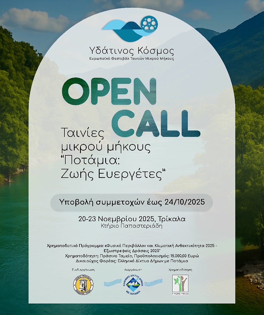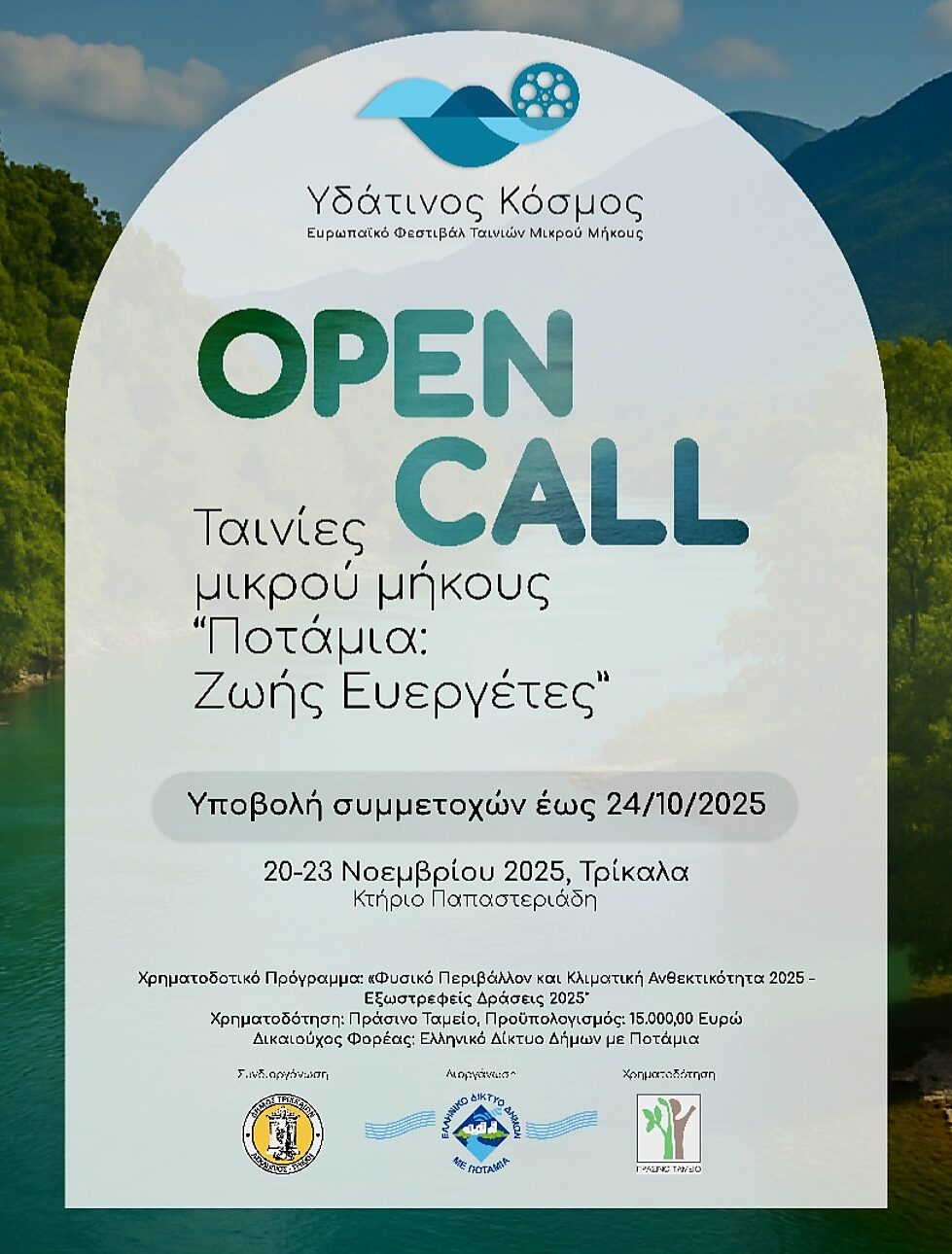 Το Ελληνικό Δίκτυο Δήμων με Ποτάμια, σε συνεργασία με το Δήμο Τρικκαίων και με χρηματοδότηση του Πράσινου Ταμείου, διοργανώνει από τις 20 έως 23 Νοεμβρίου 2025 στην πόλη των Τρικάλων, Ευρωπαϊκό Φεστιβάλ Κινηματογράφου Ταινιών Μικρού Μήκους με θέμα: ‘Υδάτινος Κόσμος’, «Ποτάμια: Ζωής Ευεργέτες».