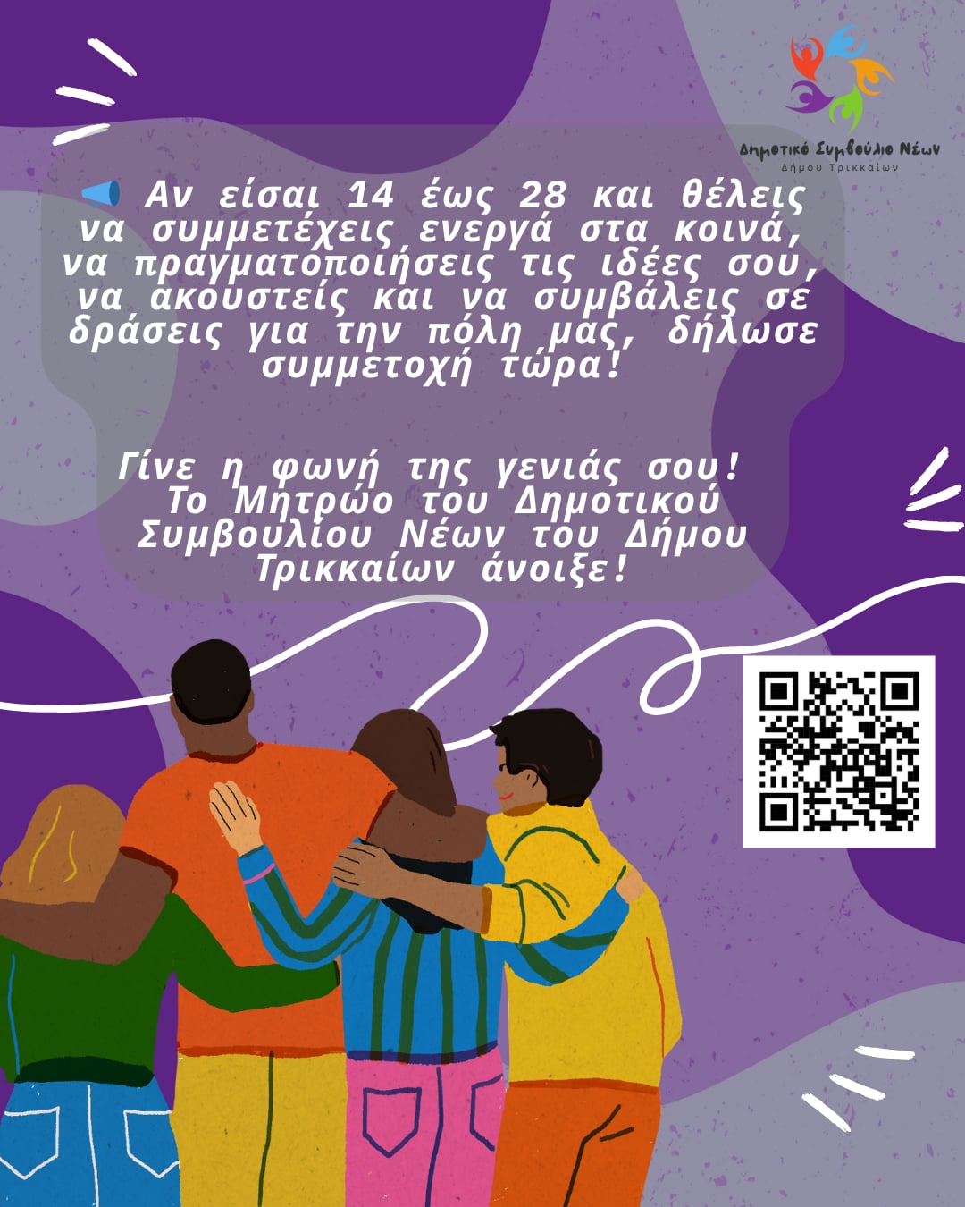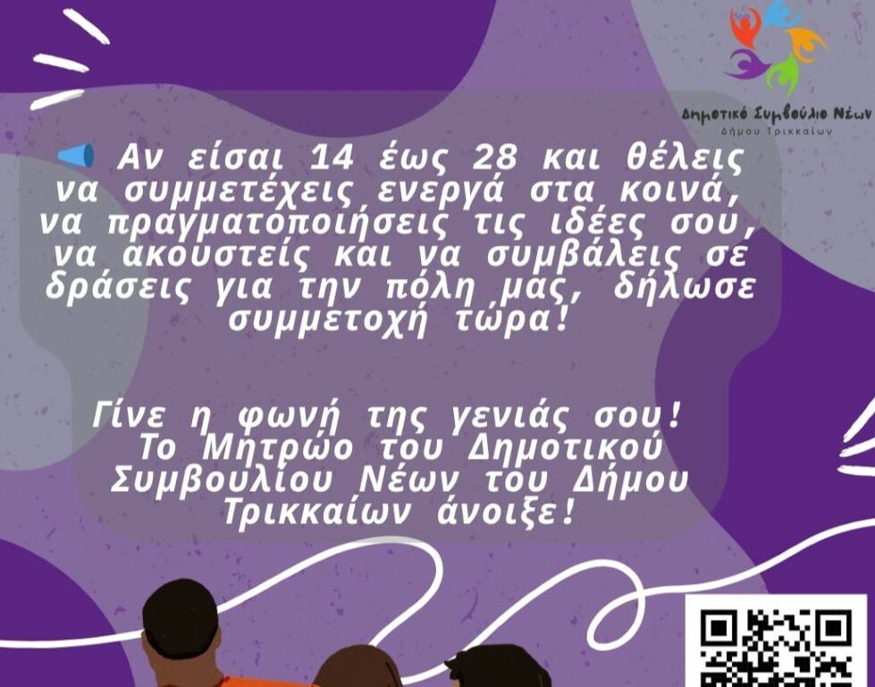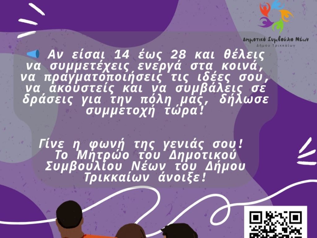 Σε νέους και νέες του Δήμου Τρικκαίων απευθύνεται το Δημοτικό Συμβούλιο Νέων, προκειμένου να ενταχθούν σε αυτό, μετέχοντας στις διαδικασίες του.