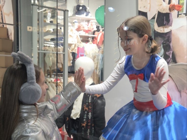 Οι βιτρίνες της τοπικής αγοράς έπαψαν να είναι απλώς τζάμια και αντικείμενα και μεταμορφώθηκαν σε μικρές σκηνές φαντασίας. Παιδιά μπήκαν μέσα τους, τις ζωντάνεψαν με σώμα, κίνηση και συναίσθημα και χάρισαν στους περαστικούς μια απρόσμενη εμπειρία χαράς και έκπληξης.