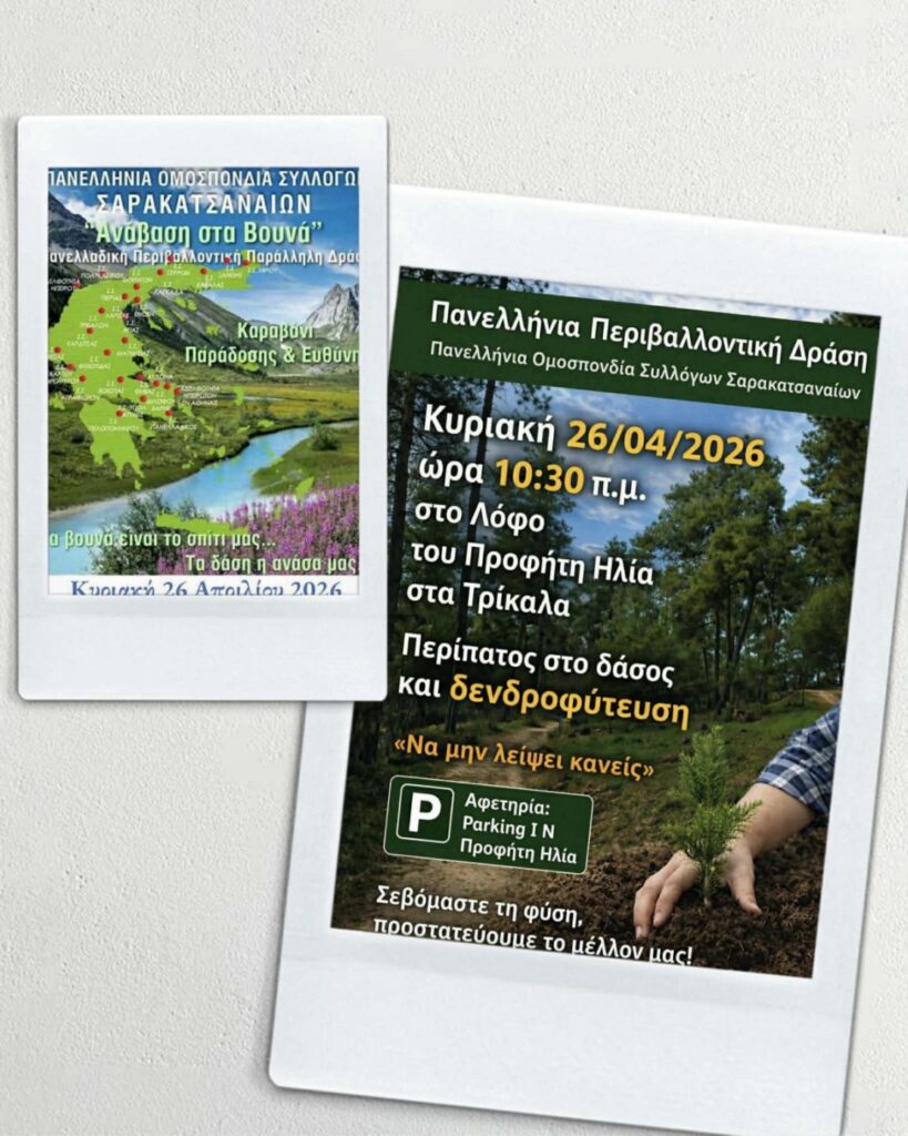 Με αφορμή τη δράση της ΠΟΣΣ που έχει ως τίτλο «Ανάβαση στα βουνά» πραγματοποιήθηκε φύτευση δέντρων στον αγαπημένο λόφο των τρικαλινών, στον Προφήτη Ηλία, την Κυριακή 26 Απριλίου 2026. Μέλη του τοπικού συλλόγου Σαρακατσαναίων Τρικάλων «Τα Κονάκια» και της ΠΟΣΣ, προέβησαν σε φύτευση συγκεκριμένων δέντρων, σε συνεργασία με τον αντιδήμαρχο Περιβάλλοντος και Αγροτικής Ανάπτυξης Παναγιώτη Ντιντή και τα στελέχη της αρμόδιας διεύθυνσης, με επικεφαλής την προϊσταμένη του τμήματος Αστικού Πρασίνου κ. Μάγδα Ράπτη.