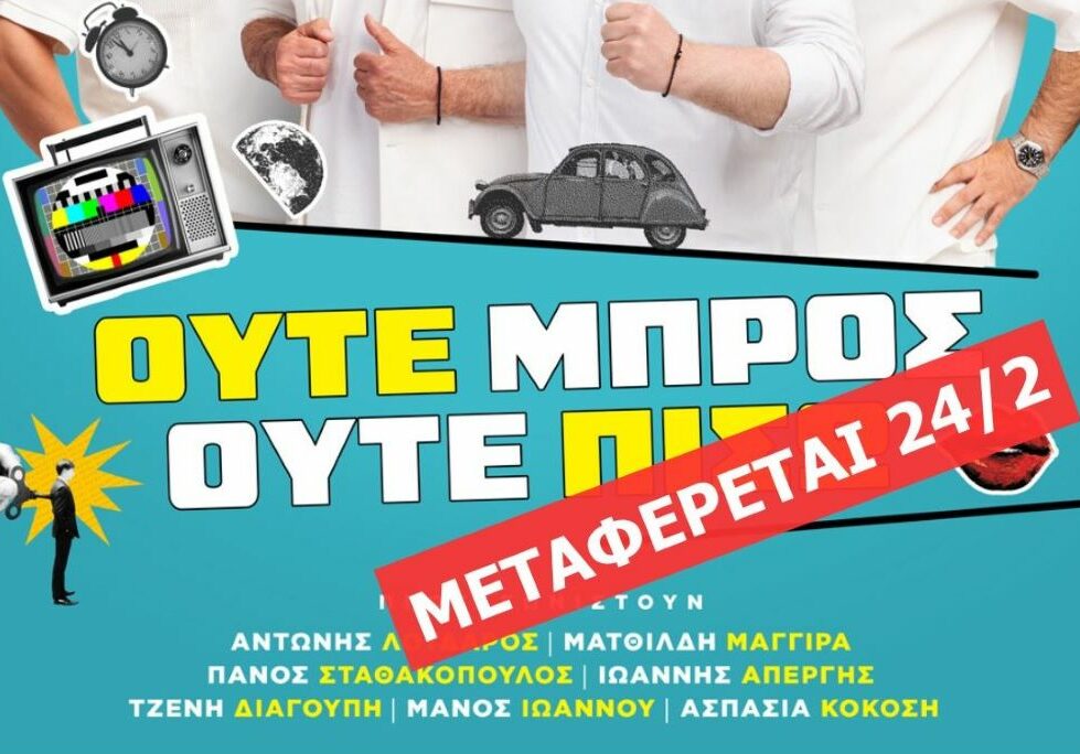 Μεταφέρεται για τις 24 Φεβρουαρίου 2026 η προγραμματισμένη για την Τρίτη 27 Ιανουαρίου 2026, θεατρική παράσταση «Ούτε Μπρος Ούτε Πίσω». Όπως τονίζεται σε δελτίο Τύπου του θιάσου της παράστασης «Ούτε Μπρος Ούτε Πίσω» των Μιχάλη Ρέππα και Θανάση Παπαθανασίου, της εταιρείας Μέθεξις και του Χρήστου Τριπόδη, «σε ένδειξη σεβασμού και συμπαράστασης στο βαρύ πένθος της πόλης για το τραγικό δυστύχημα που σημειώθηκε στο εργοστάσιο της βιομηχανίας Βιολάντα, η παράσταση «Ούτε Μπρος Ούτε Πίσω». αναβάλλεται.
