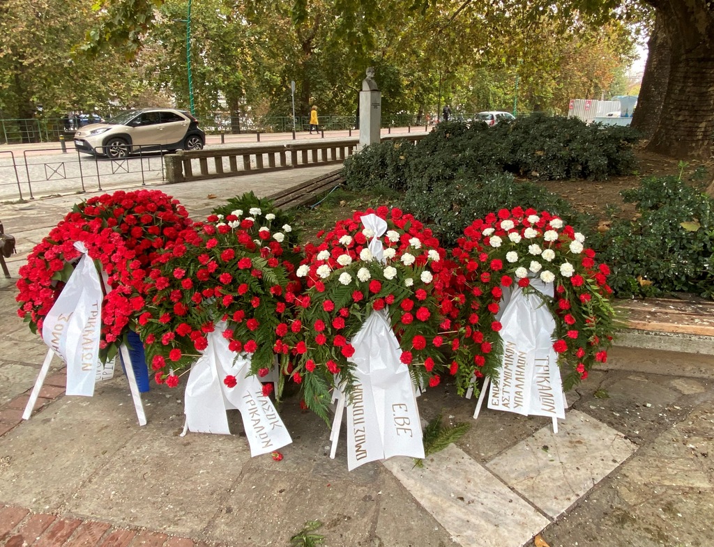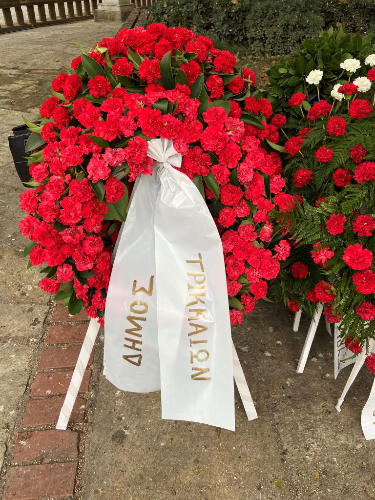 Ακολούθησε κατάθεση στεφάνων από τον Δημαρχεύοντα Τρικκαίων Μιχάλη Λάππα, Αντιδήμαρχο Παιδείας, Πολιτισμού, Αθλητισμού και Δημοσίων Σχέσεων του Δήμου Τρικκαίων, την αντιπεριφερειάρχη ΠΕ Τρικάλων Χρύσα Ντιντή, τους Διευθυντές Πρωτοβάθμιας και Δευτεροβάθμιας Εκπαίδευσης Τρικάλων κ. Χρήστο Τρικάλη και Αλέξανδρο Καπανιάρη αντιστοίχως, τον γραμματέα της ΝΕ Τρικάλων του ΠΑΣΟΚ – Κίνημα Αλλαγής κ. Γιάννη Τριγώνη, τον γραμματέα της ΝΕ Τρικάλων του ΣΥΡΙΖΑ – Προοδευτική Συμμαχία κ. Ευάγγελο Κείο, τον εκπρόσωπο της Νέας Αριστεράς Τρικάλων κ. Μπάμπη Μουργελά, το μέλος της Γραμματείας της Περιφερειακής Οργάνωσης Θεσσαλίας του «Κινήματος» Δημοκρατίας κ. Γιώργο Τσιάκαλο, τον πρόεδρο της ΝΕ Τρικάλων του ΤΕΕ κ. Αποστόλη Μπαταβάνη, τον αντιπρόεδρο της Ομοσπονδίας ΕΒΕ Τρικάλων κ. Χρήστο Σίμο, τον αντιπρόεδρο του Εμπορικού Συλλόγου Τρικάλων κ. Θανάση Φαλτάκα, την πρόεδρος του Ιατρικού Συλλόγου Τρικάλων κ. Μαρία Αθανασίου – Γιαγιάκου, τον πρόεδρος του Συλλόγου Πολιτικών Συνταξιούχων Τρικάλων κ. Γιάννη Κοκόρα, τον αν. ΓΓ της Ένωσης Αστυνομικών Υπαλλήλων Τρικάλων κ. Αριστοτέλη Σιακαβάρα, τον επικεφαλής του ΑΚΕΠ Τρικάλων κ. Βαγγέλης Πέττας, ο οποίος νωρίτερα απηύθυνε σύντομο χαιρετισμό.
