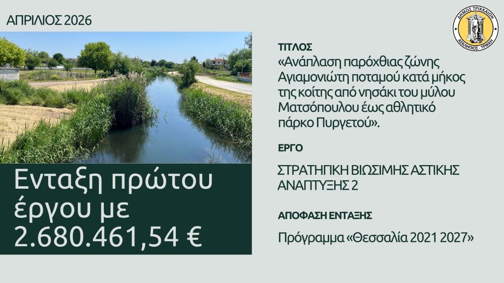 Η Περιφέρεια Θεσσαλίας δημοσιοποίησε την ένταξη από τον Περιφερειάρχη Θεσσαλίας Δημήτρη Κουρέτα, του πρώτου από τα 3 συνολικά έργα του Δήμου Τρικκαίων για την ανάπλαση της παρόχθιας ζώνης του Αγιαμονιώτη ποταμού. Φέρει τον τίτλο ««Ανάπλαση παρόχθιας ζώνης Αγιαμονιώτη ποταμού κατά μήκος της κοίτης από νησάκι του μύλου Ματσόπουλου έως αθλητικό πάρκο Πυργετού».