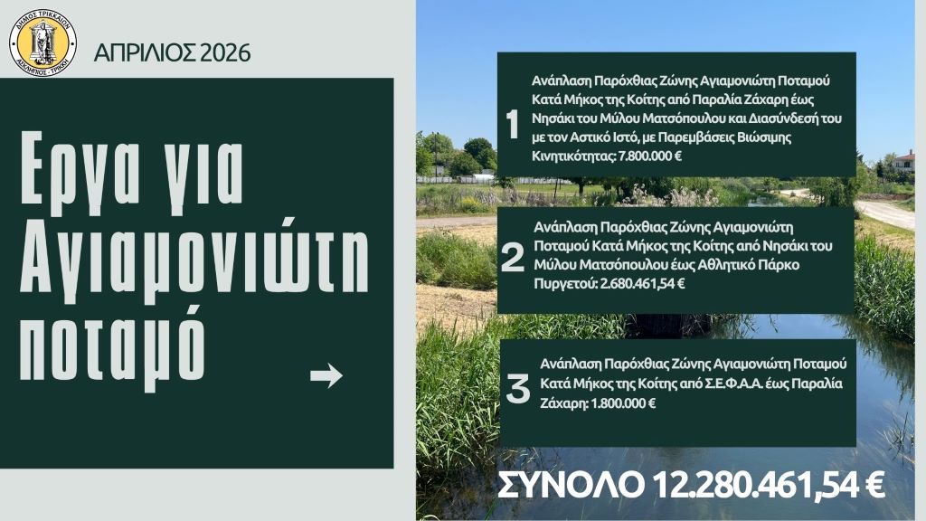 Ο συνολικός προϋπολογισμός των 3 έργων του Δήμου Τρικκαίων για τον Αγιαμονώτη ποταμό ανέρχεται στα 12.280.461,54 €.