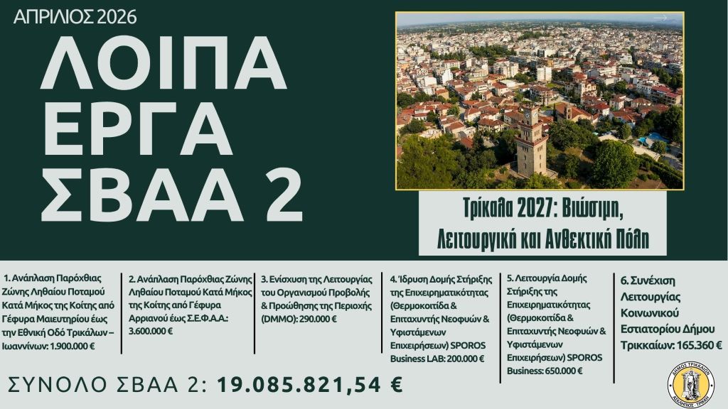Η ΣΒΑΑ έχει τίτλο «Τρίκαλα 2027: Βιώσιμη, Λειτουργική και Ανθεκτική Πόλη», αποτελείται από συνολικά 9 νέα έργα ύψους 19.085.821,54 €. Πρόκειται για την επόμενη φάση του σχεδιασμού του Δήμου Τρικκαίων να υλοποιήσει ένα πρόγραμμα έργων που θα συνδυάζει
