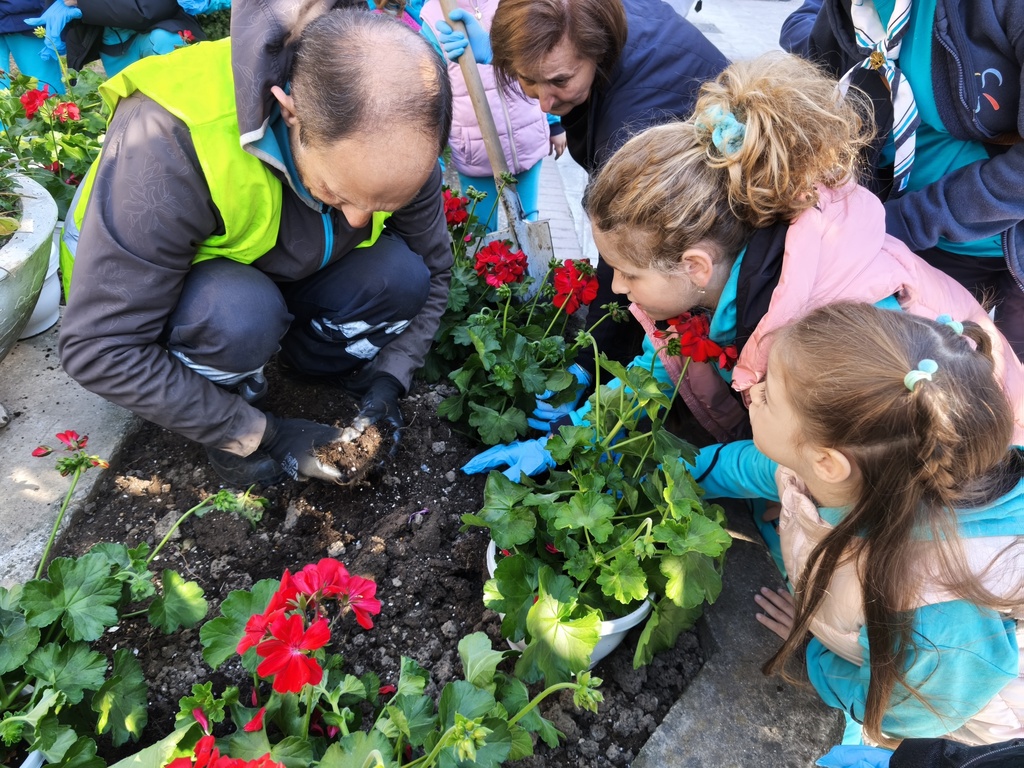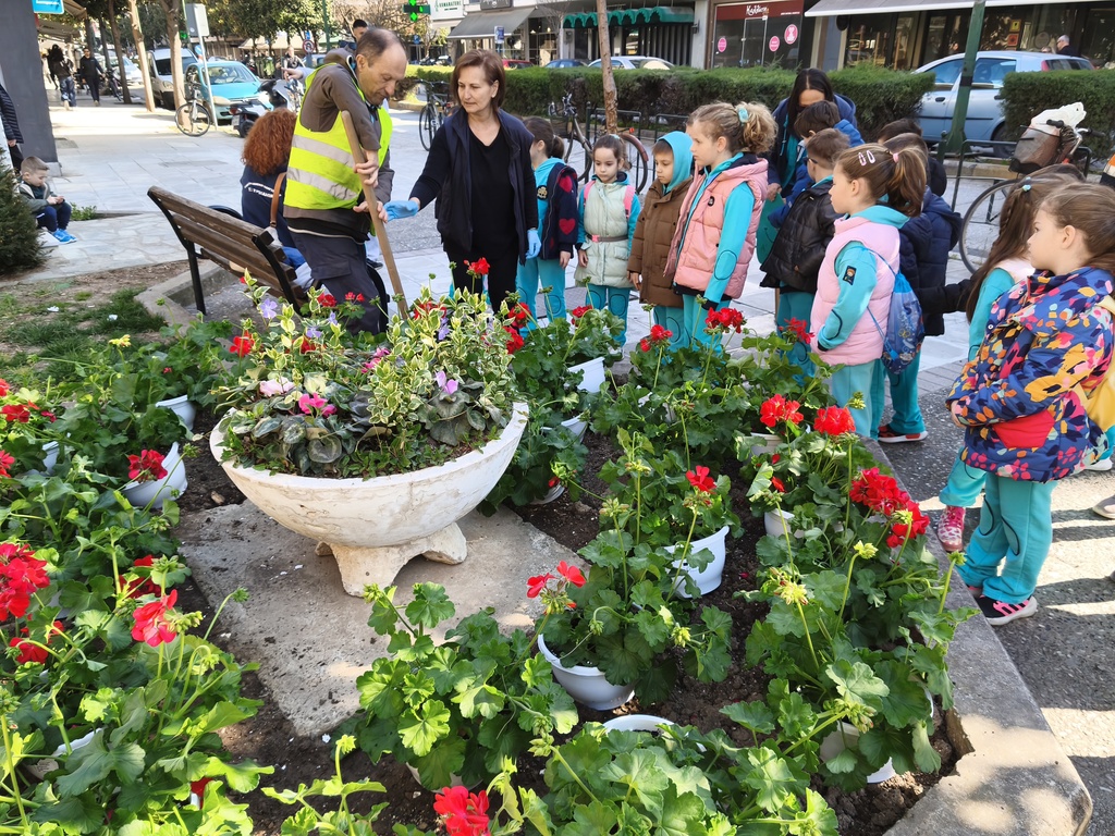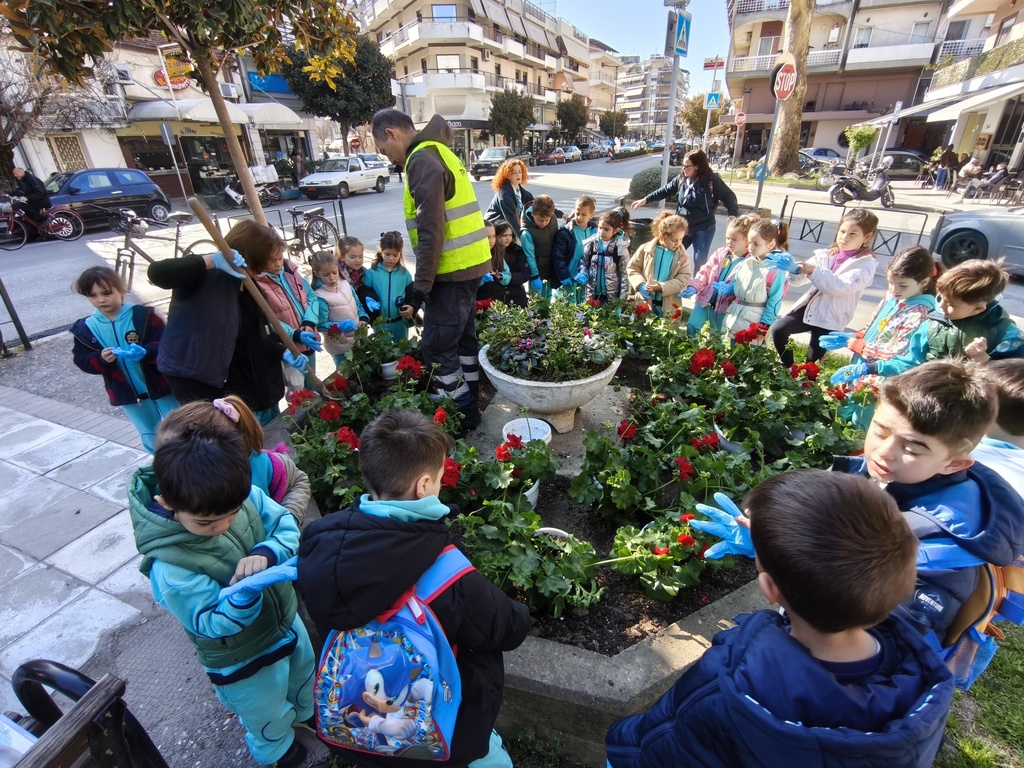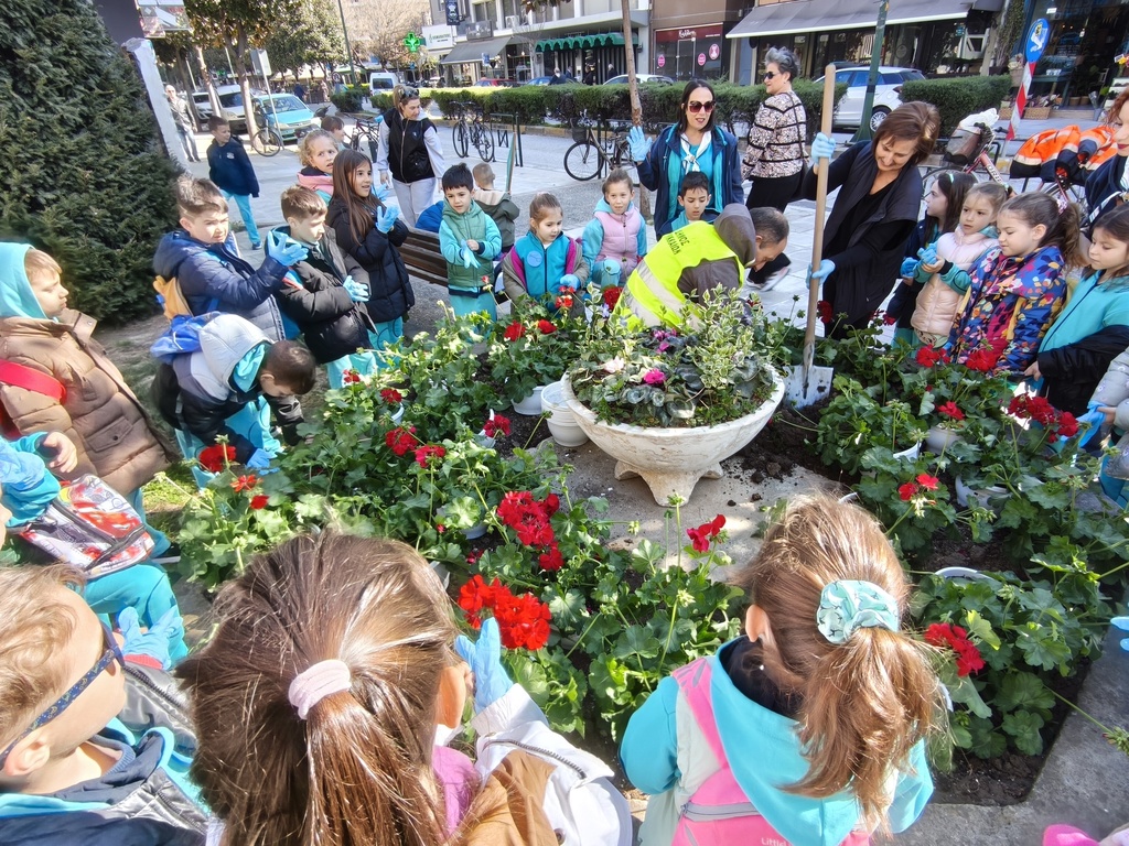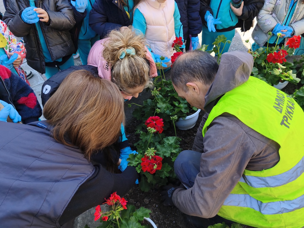 Πλέον, με τη συνδρομή των υπαλλήλων του Δήμου Τρικκαίων και τη στήριξη των υπεύθυνων στου ΣΕΟ στα Τρίκαλα, ανά δυάδες τα παιδιά είδαν στην πράξη τη φύτευση. Οι όμορφες μολόχες στο νέο παρτέρι, κοσμούν πλέον μια κεντρική πλατεία των Τρικάλων, με ιστορική σημασία.