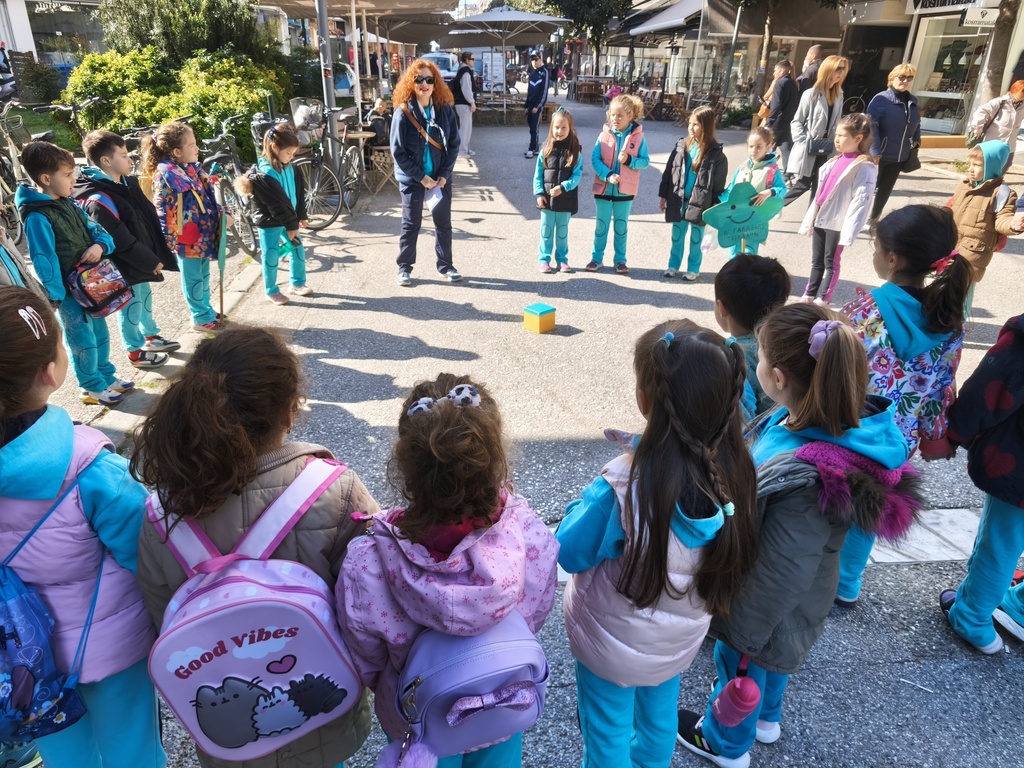Μια και δυο, μέσω των πεζοδρομίων και με τις φωνούλες τους να ηχούν όμορφα στο ηλιόλουστο πρωινό, έφτασαν στο παρτέρι της πλατείας Αγροτικής και Λαϊκής Εξέγερσης 1925, στη γωνία των οδών Ιπποκράτους και Ασκληπιού.