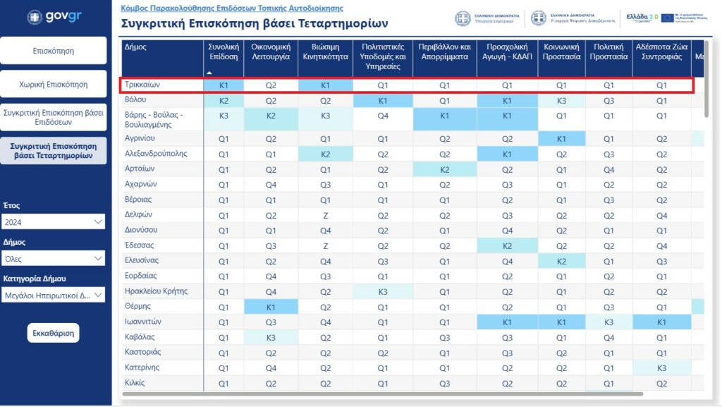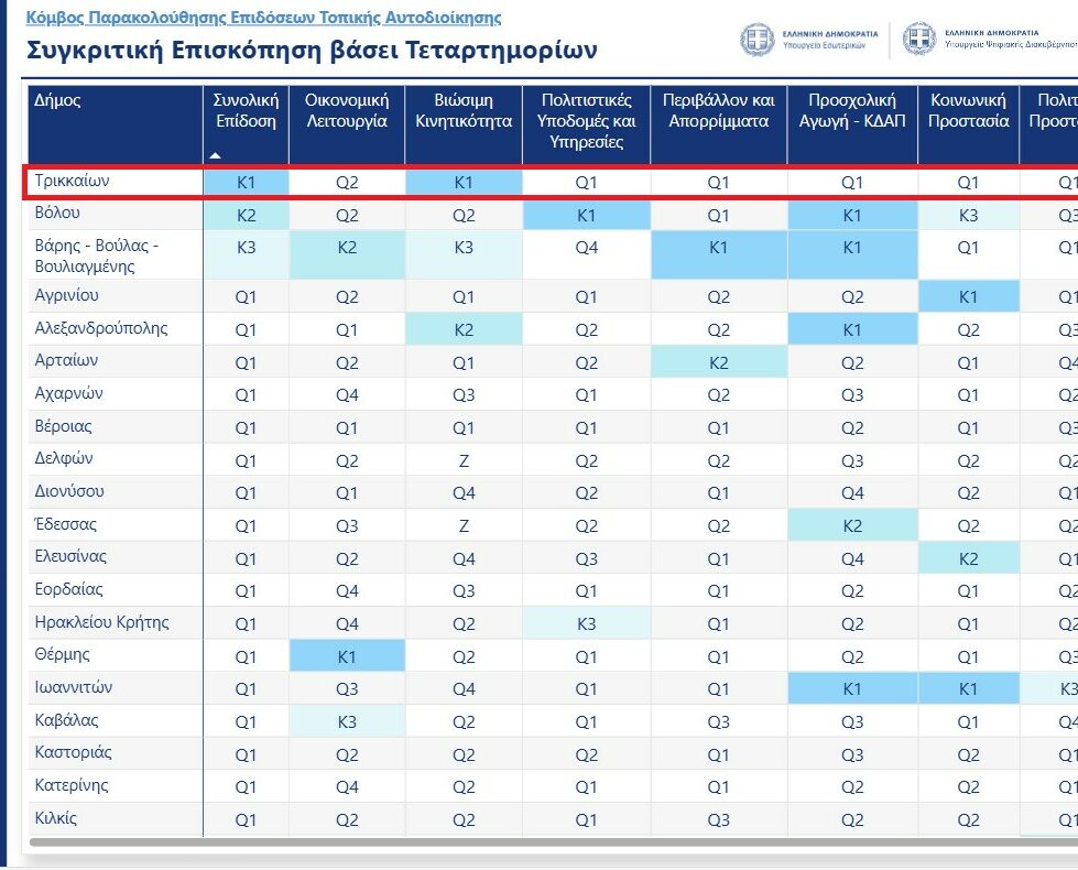 Η διάκριση αυτή αποκτά ακόμη μεγαλύτερη αξία, καθώς βασίζεται σε ένα ολοκληρωμένο και αντικειμενικό σύστημα αξιολόγησης, που καλύπτει 9 κρίσιμους τομείς λειτουργίας των Δήμων: Οικονομική λειτουργία, Βιώσιμη Κινητικότητα, Πολιτιστικές Υποδομές και Υπηρεσίες, Περιβάλλον και Απορρίμματα, Προσχολική Αγωγή – ΚΔΑΠ, Κοινωνική προστασία, Πολιτική προστασία, Αδέσποτα Ζώα Συντροφιάς, Ψηφιακός Μετασχηματισμός, με τον Δήμο Τρικκαίων να καταγράφει υψηλούς δείκτες.