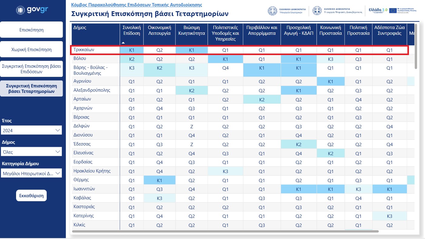Ο Δήμος Τρικκαίων επεξεργάζεται όλα τα στοιχεία, εξετάζοντας και αξιολογώντας τους επιμέρους δείκτες, που αναδεικνύουν το παραγόμενο έργο και την προσπάθεια που καταβάλλεται, για τη βελτιωμένη και βιώσιμη καθημερινότητα στην πόλη και τα χωριά.