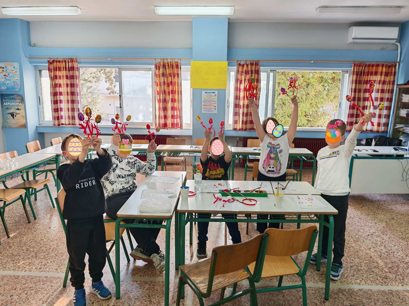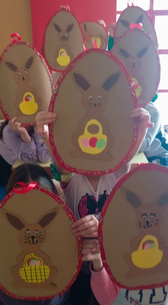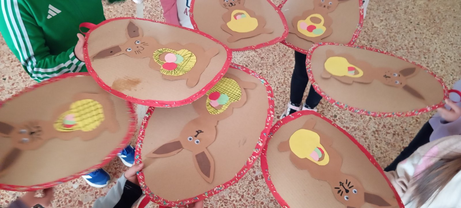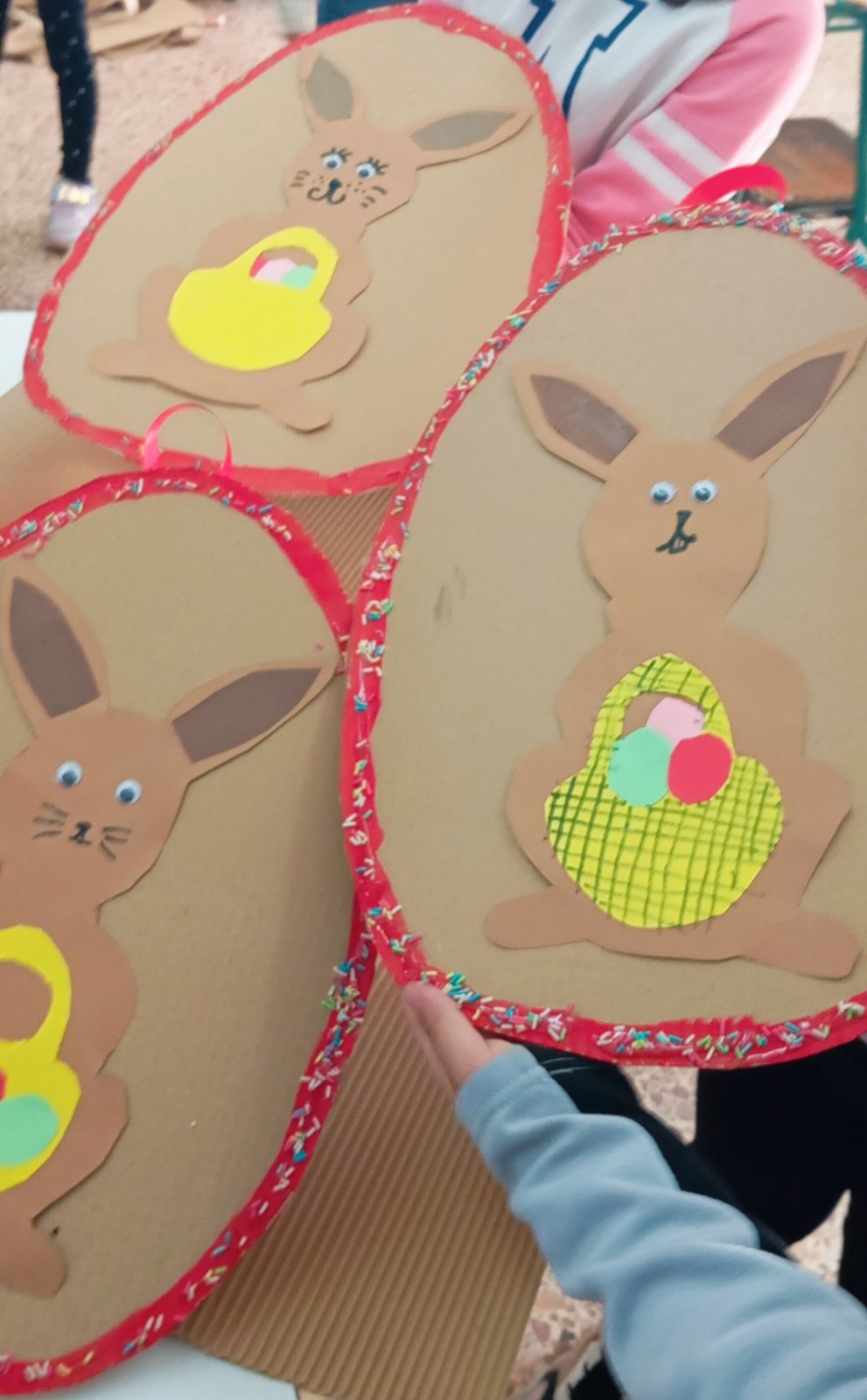 Στο πλαίσιο των πασχαλινών εργαστηρίων, οι μικροί δημιουργοί κατασκεύασαν μεγάλες κουνελοκορνίζες, συμβάλλοντας με τον δικό τους ξεχωριστό τρόπο στον στολισμό των χώρων του ΚΔΑΠ. Παράλληλα, με χρωματιστές κιμωλίες, ζωγράφισαν την αυλή του σχολείου, γεμίζοντάς την με πασχαλινά αυγά και ανοιξιάτικα σχέδια.