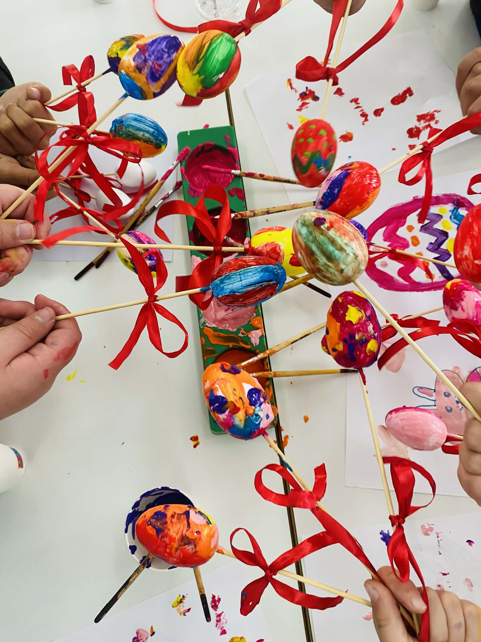 Μέσα από αφηγήσεις και την προβολή παιδικής ταινίας, τα παιδιά γνώρισαν στοιχεία από τη ζωή του Χριστού, ενώ στη συνέχεια δημιούργησαν όμορφα μπουκέτα με κόκκινα αυγά, κορδέλες και πασχαλινά στολίδια, διακοσμώντας ακόμη περισσότερο τον χώρο του ΚΔΑΠ.