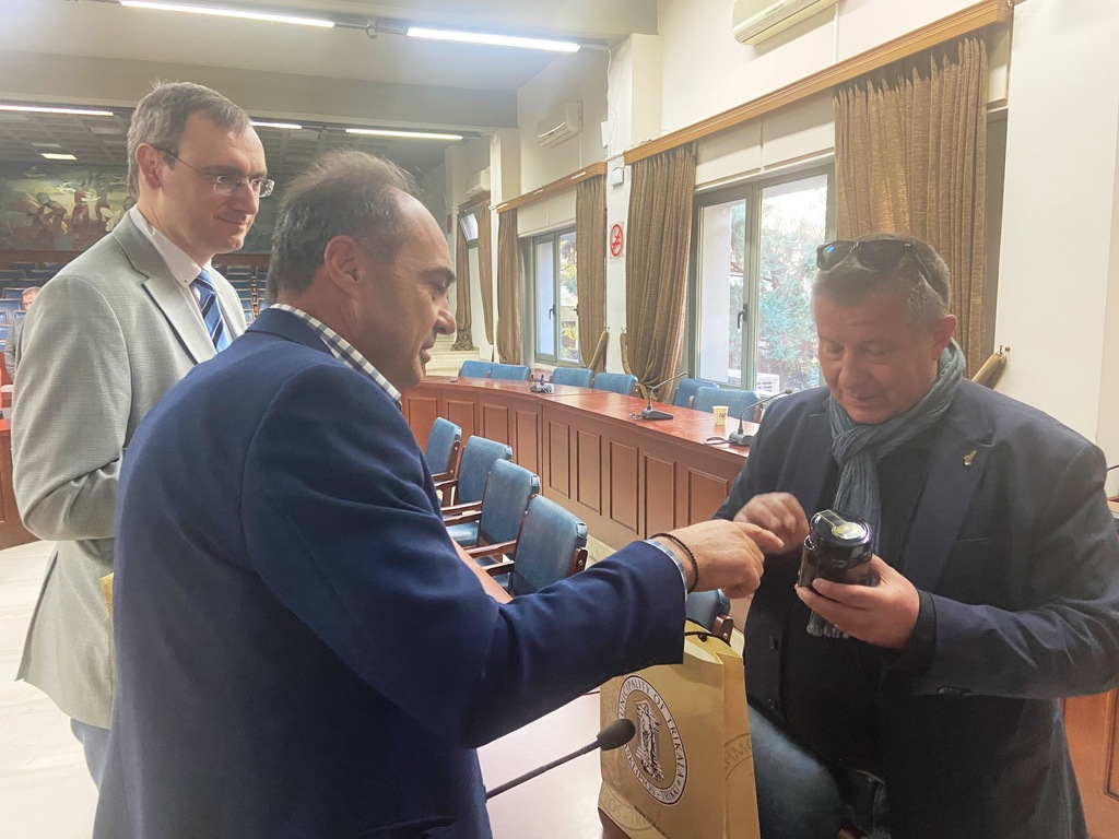 Μετά τις ανταλλαγές δώρων, έγινε ενημέρωση από τον προϊστάμενο της Δ/νσης ΠαιδείαςM Πολιτισμού, Αθλητισμού του Δήμου Τρικκαίων κ. Στέφανο Νταλάση για το Φεστιβάλ Κωμωδίας και τις συνολικότερες δράσεις πολιτισμού που υλοποιεί ή ετοιμάζει ο Δήμος Τρικκαίων.
