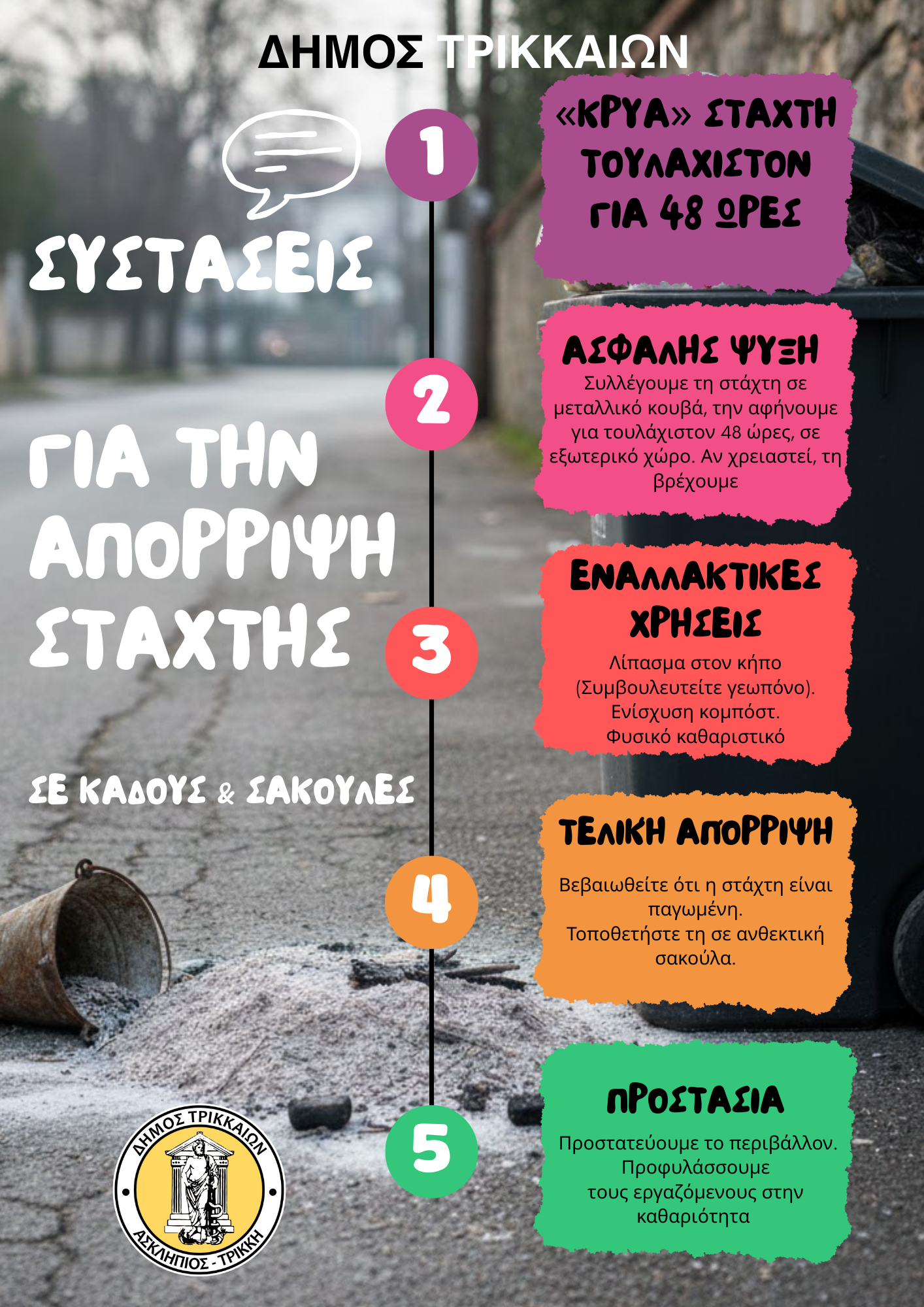 Ιδιαίτερη προσοχή εφιστά και φέτος ο Δήμος Τρικκαίων στην αυθαίρετη και βιαστική απόρριψη στάχτης (από τζάκια ή σόμπες) σε κάδους απορριμμάτων. Όπως επεσήμανε ο αρμόδιος αντιδήμαρχος Ανταποδοτικών Υπηρεσιών Τάκης Παζαΐτης, «έχει σημασία να προσέχουμε τη στάχτη, πριν την απορρίψουμε στους κάδους, καθώς αυτοί παίρνουν φωτιά». Ηδη, έχουν παρατηρηθεί φαινόμενα καύσης κάδων από τις στάχτες, σε δύο σημεία της πόλης των Τρικάλων.