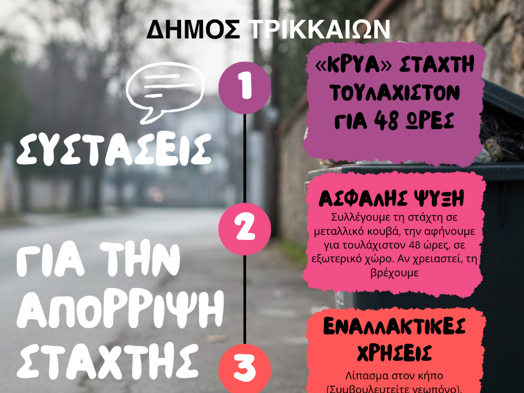 Ιδιαίτερη προσοχή εφιστά και φέτος ο Δήμος Τρικκαίων στην αυθαίρετη και βιαστική απόρριψη στάχτης (από τζάκια ή σόμπες) σε κάδους απορριμμάτων. Όπως επεσήμανε ο αρμόδιος αντιδήμαρχος Ανταποδοτικών Υπηρεσιών Τάκης Παζαΐτης, «έχει σημασία να προσέχουμε τη στάχτη, πριν την απορρίψουμε στους κάδους, καθώς αυτοί παίρνουν φωτιά». Ηδη, έχουν παρατηρηθεί φαινόμενα καύσης κάδων από τις στάχτες, σε δύο σημεία της πόλης των Τρικάλων.