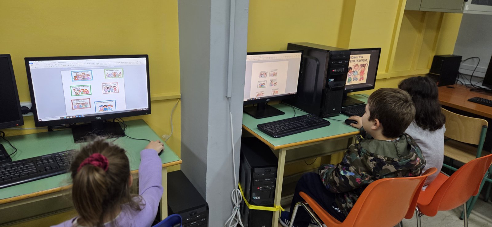 • Στα τμήματα της Πληροφορικής τα παιδιά έφτιαξαν ένα ψηφιακό κολάζ με εικόνες από τα δικαιώματα του παιδιού χρησιμοποιώντας ένα πρόγραμμα επεξεργασίας εικόνων, προκειμένου να ταυτίσουν τον υπολογιστή με μια μηχανή που βοηθάει τον άνθρωπο στην εργασία του και που μπορεί να τον χρησιμοποιήσει για παιχνίδι και διασκέδαση. Να μάθουν να εκφράζονται με δημιουργικό τρόπο, χρησιμοποιώντας λογισμικά σχεδίασης και επεξεργασίας, αναπαραγωγής, καταγραφής εικόνας, αλλά και να δημιουργήσουν δικές τους συνθέσεις με τα λογισμικά έκφρασης και δημιουργίας. (Καθηγήτρια Πληροφορικής και Ρομποτικής: Χριστίνα Μητσιάδη).