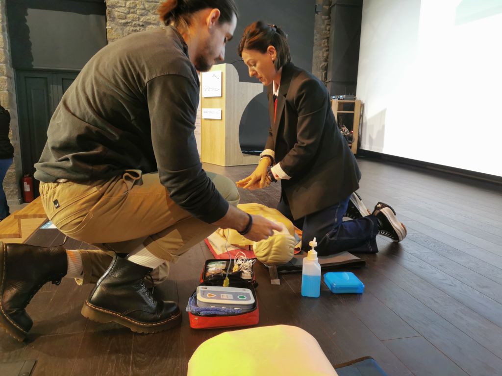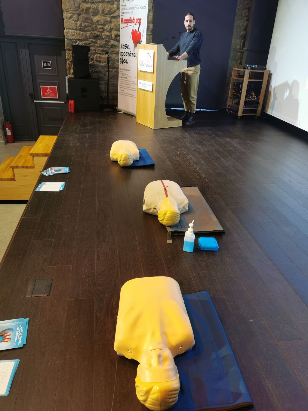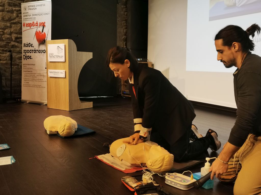 Ακολούθησε η ομιλία και η επίδειξη ΚΑΡΠΑ ενώπιον των παρισταμένων, από την κ. Ελένη Πολύζου MDMSc Αναισθησιολόγο, ερευνήτρια ΤΕΦΑΑ ΠΘ, διευθύντρια σεμιναρίων BLS/AEDEC σχετικά με την παροχή πρώτων βοηθειών σε περιπτώσεις καρδιακής προσβολής και πνιγμονής. Σε πραγματικό χρόνο, οι κ.κ. Ευθυμίου Γεώργιος (MDBSc MSc PhD, Ειδικευόμενος Ιατρός Εσωτερικής Παθολογίας ΓΝ Τρικάλων, Εκπαιδευτής BLS/AED και ALSERC), Ντούμας Ηλίας (MScPhDc, Καθηγητής Φυσικής Αγωγής, Εκπαιδευτής BLS/AEDERC), Οικονόμου Λαμπρινή MEd, Εκπαιδευτικός Πρωτοβάθμιας Εκπαίδευσης, Εκπαιδεύτρια BLS/AEDERC), Ευθυμίου Ελισάβετ (BSc, Διαιτολόγος – Διατροφολόγος, Εκπαιδεύτρια BLS/AEDERC) πραγματοποίησαν σεμινάριο ΚΑΡΠΑ. Επίσης αναφέρθηκαν σε θέματα διατροφής και γενικότερα σε σχέση με την παροχή πρώτων βοηθειών.